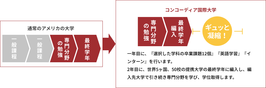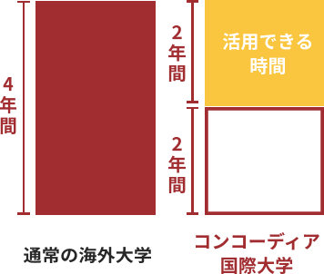 通常の海外大学は4年間で卒業しますが、 コンコーディア国際大学はその半分の2年間で卒業できるので、余った時間を有効に活用できます。