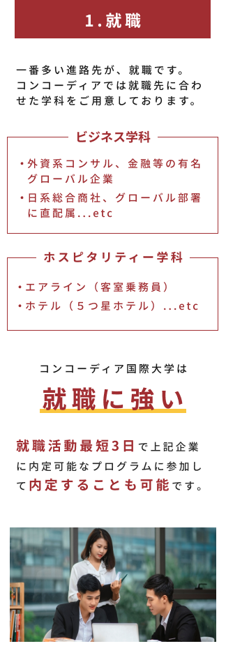 日本の大学を卒業した人には得られない、就職のチャンスが得られます。 例えば、1年目から海外のチームに派遣されたり、即戦力とみなされ平均給料が非常に高い採用となる可能性があります。 さらに、海外の大学を卒業することによって、海外大学を卒業した人のみの選考フローに参加できたり、 企業側から学生にスカウトされる場合があります。そのため、ご自身の理想の企業を選ぶことができます。